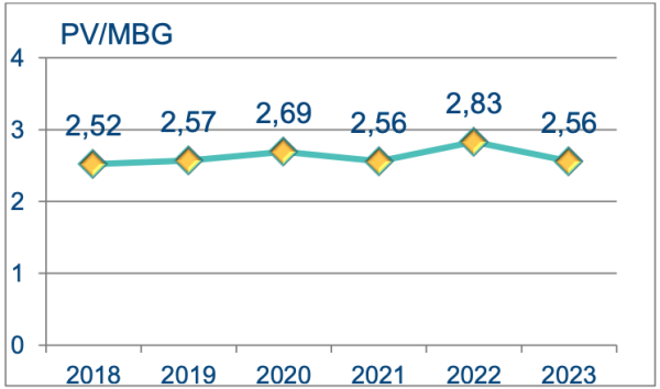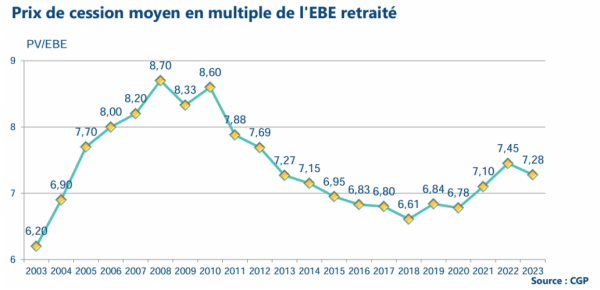 Le prix de cession en multiple de l’EBE retraité (déduction faite de la rémunération brute du titulaire de 66 K€) est estimé à 7,28 en 2023, en repli par rapport à l’année précédente.